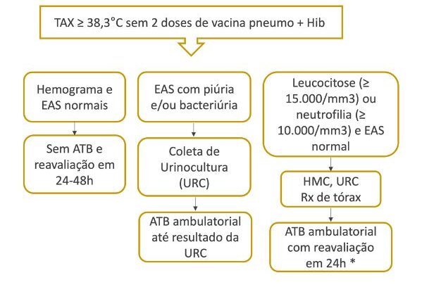 Primeiro passo: caso a criança apresente alguma comorbidade (imunodeficiência, anemia falciforme, neoplasia, desnutrição, doença cardíaca congênita), deve ser internada para a realização de exames laboratoriais e tratamento com antibioticoterapia intravenosa até descartar a possibilidade de bacteremia. Crianças com comorbidades apresentam maior risco para a bacteremia oculta.